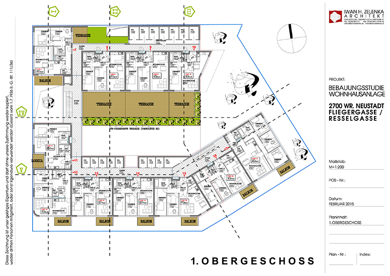 Die Bebauungsstudie umfasst eine 3-geschoßige Wohnhausanlage mit 25 Wohneinheiten mit Terrassen und Balkonen. Im Erdgeschoß befinden sich die PKW-Stellplätze und 6 Wohnungen, die über einen Eigengarten verfügen.